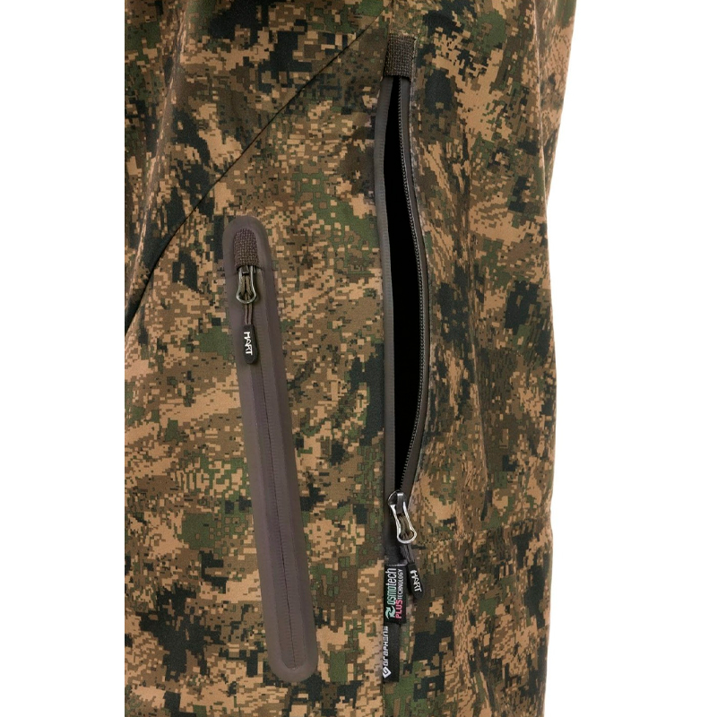 El bolsillo de carga, ubicado estratégicamente en el centro del tronco, permite una gran capacidad de almacenamiento y oculta bolsos específicos para diferentes usos como radio/GPS, teléfono móvil y un peine de balas desmontable. Puerto multimedia para dirigir el cable de los auriculares hacia el interior de la chaqueta. Todos tus accesorios estarán a mano pero protegidos de enganches no deseados en los arbustos.