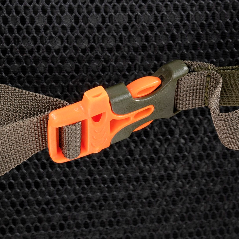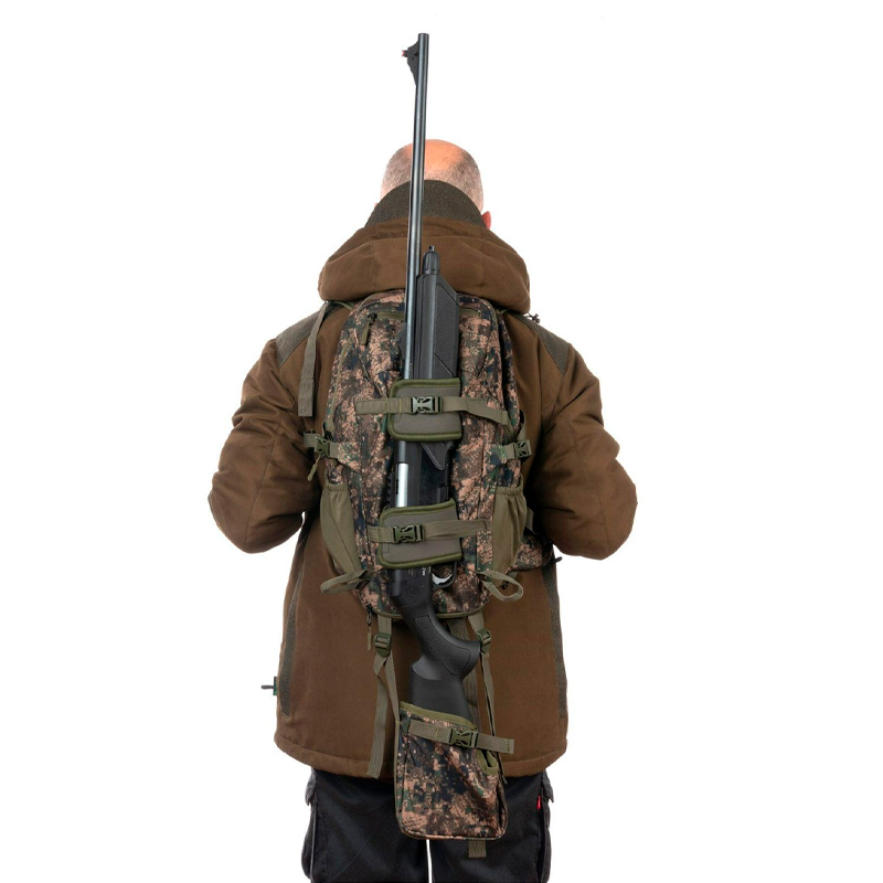 Altura adaptable mediante tirantes regulables, correa ajustable deslizante para el pecho con silbato de emergencia, y cinturón con ceñidores. Equipado con un sistema frontal de fácil acceso para la sujección del rifle: bolso ajustable y retráctil en el bolsillo inferior para sujetar y ajustar de forma segura la culata del rifle además de dos piezas de neopreno Safe Guard para abrazar y sostener con cuidado el guardamanos y la mira del rifle y sujetarlo en la mejor posición.