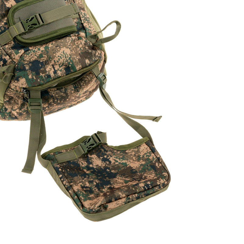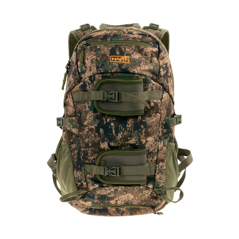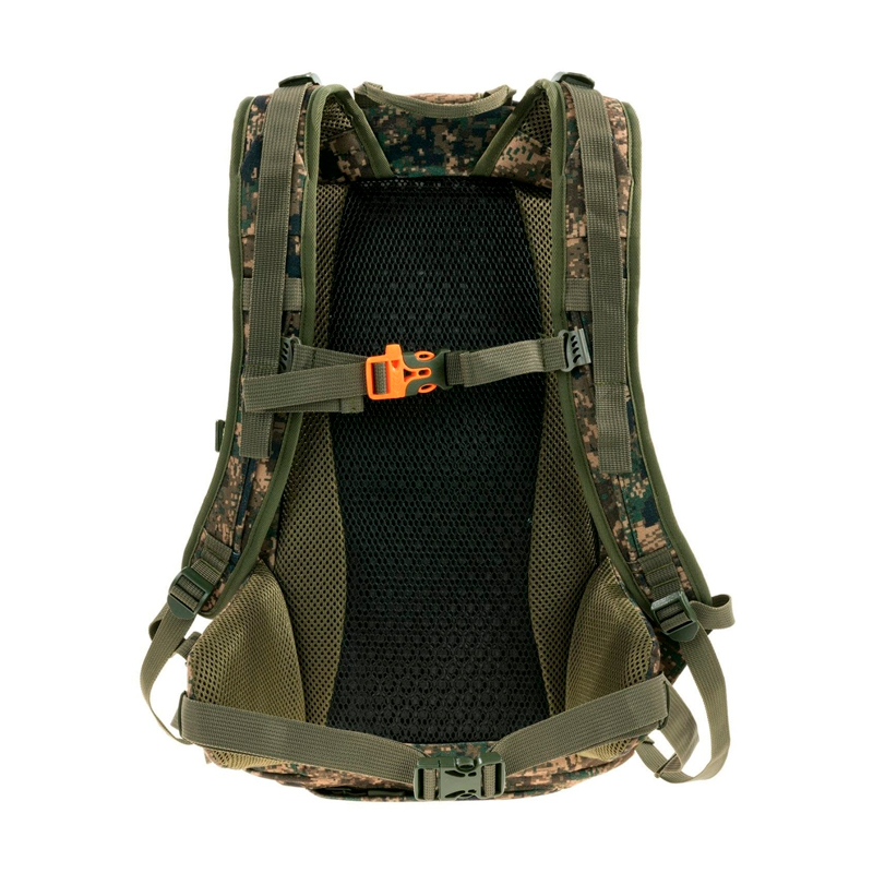 Tejido de politricot cepillado resistente al agua. Diseño compacto para llevar lo necesario en un día de caza. Acolchado trasero ventilado preformado de malla y EVA, correas ajustables para los hombros y acolchado ergonómico para la cadera. La malla con EVA ayuda a que la mochila se separe del cuerpo y maximiza el flujo de aire por la espalda para reducir la transpiración.